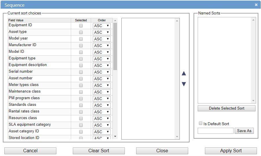 You can use the Sort feature to display the data in the grid in an order other than the screen’s default sort. For example, the Work Order Center screen’s default sort order is date and time in, descending.